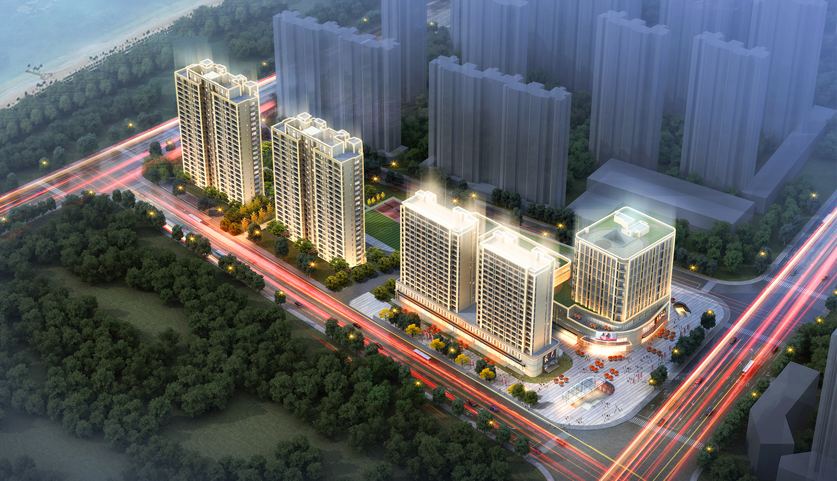 合理的功能分區(qū),沿城市主干道打造社區(qū)服務(wù)配套設(shè)施,服務(wù)小區(qū)及周邊居民,住宅建筑在融合城市肌理的情況下,最大限度遠離北側(cè)已建的住宅區(qū),減少對北側(cè)已有住宅的遮擋及影響。本項目充分利用地下公交首末站,采用了類地鐵上蓋的商業(yè)模式。
