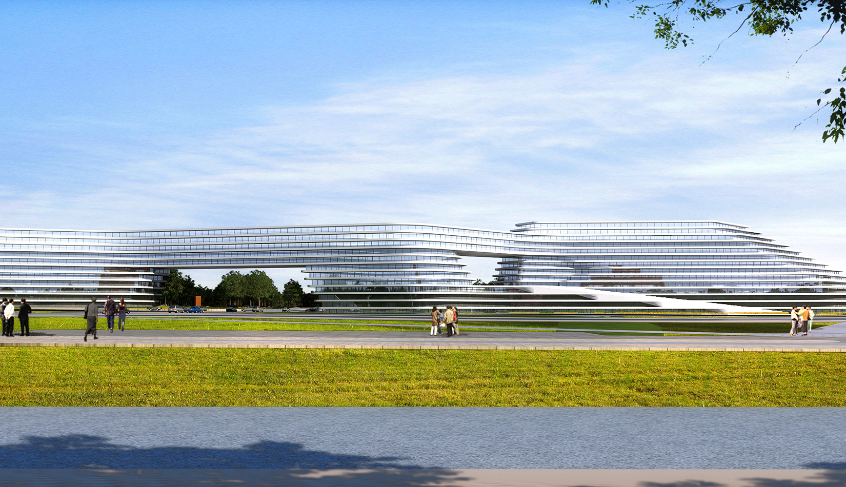 科學(xué)講堂位于中心區(qū)景觀主軸的中心腹地,其南的泄洪渠為景觀主軸的景觀帶。設(shè)計(jì)靈感源于中國(guó)天人合一的自然觀和社會(huì)觀,所謂仁者樂(lè)山智者樂(lè)水,通過(guò)對(duì)山、水肌理的分析與重構(gòu),轉(zhuǎn)換為建筑語(yǔ)言,形成獨(dú)具特色的建筑造型。建筑體量形成簡(jiǎn)單、沖突的場(chǎng)地氛圍,建筑南向正對(duì)園區(qū)中軸線,使得水平向延展的建筑生成了“東高西低”的無(wú)邊際界面。由“水面→河岸→場(chǎng)地→建筑”的溪水肌理驅(qū)動(dòng)建筑臨街面,逐步退后產(chǎn)生特有的河流沖刷意象。水流的蜿蜒曲折使建筑的轉(zhuǎn)彎處成洞,達(dá)到了內(nèi)外視線連續(xù)的綜合效果,并將對(duì)建筑的擠壓力平衡到建筑東西兩翼。建筑表皮通過(guò)對(duì)水的情緒變化等模擬,形成片狀的建筑造型。