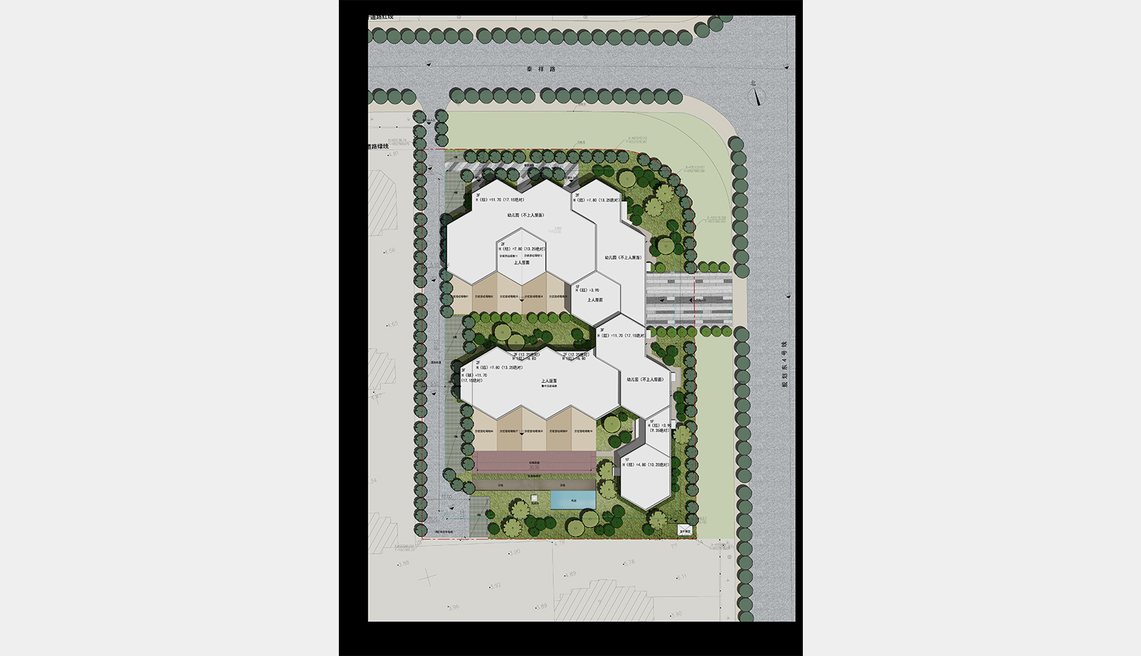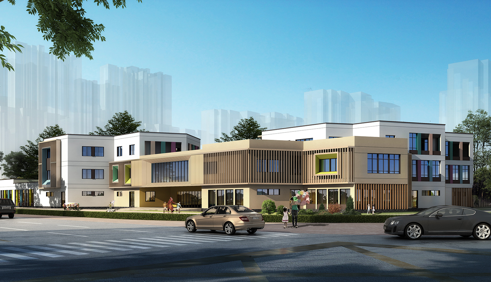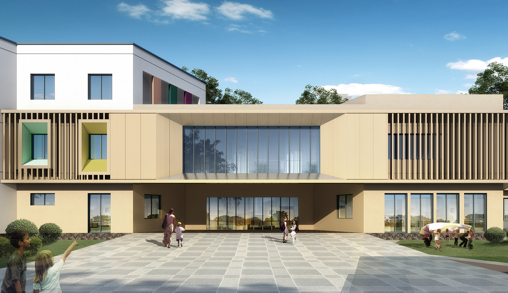 整體建筑以暖色調(diào)為主,旨在為幼兒營造一種溫馨的環(huán)境氛圍,以紅色陶土板為基調(diào),與周邊古典風(fēng)格的住宅區(qū)相融合。彩色的運(yùn)用象征著孩子活潑多彩的個(gè)性,迎合了孩子對色彩的敏感特性,營造出一種五彩斑斕的活潑的環(huán)境氛圍;彩色具有強(qiáng)調(diào)作用,可以突出建筑作為幼兒園的功能性,同時(shí)白色作為整體環(huán)境的基調(diào)色,協(xié)調(diào)了不同色彩間的沖突感受,使建筑氛圍呈現(xiàn)簡潔明凈而又突顯夢幻的特點(diǎn)。
