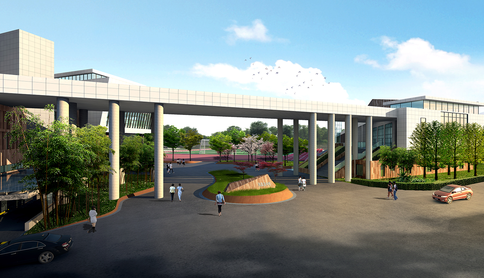 1. 將抽象化的鳳翎設(shè)計成特色種植,結(jié)合建筑形態(tài)配以流線型鋪裝設(shè)計,在鋪裝上增加鳳凰島中學(xué)校訓(xùn)校風(fēng)的細節(jié)設(shè)計,凸顯學(xué)校濃郁的文化氛圍以及室外景觀環(huán)境的精致。