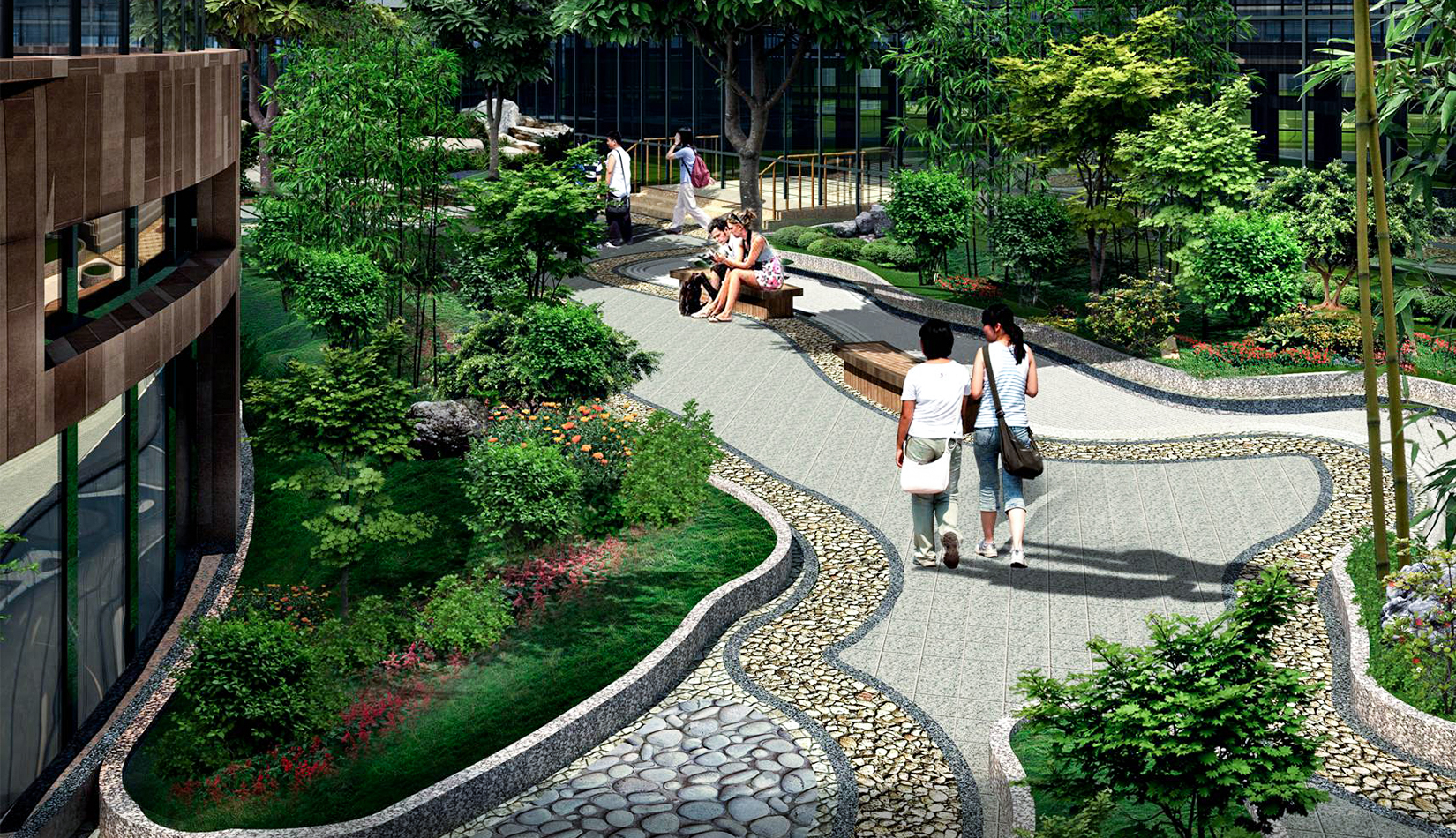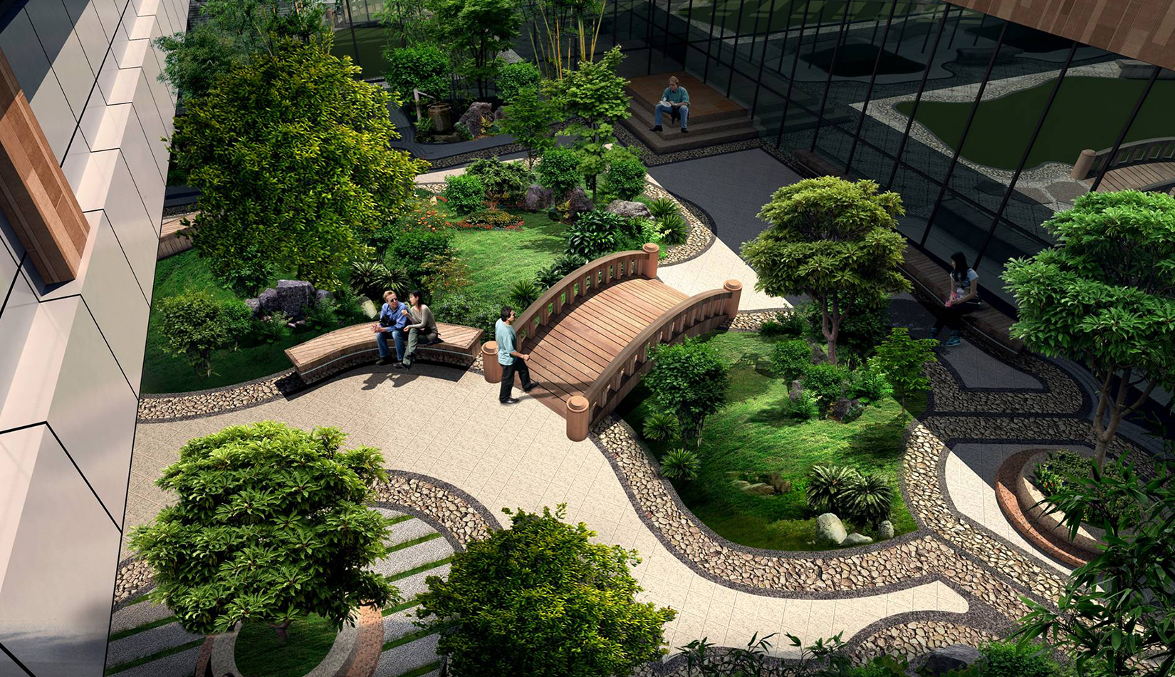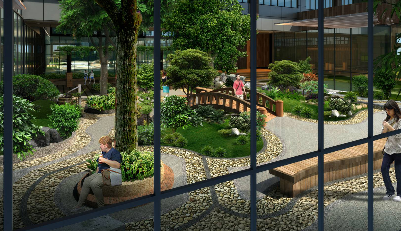 2. 綜合服務(wù)樓中心設(shè)計特色水景一處,潺潺的流水聲,增加整個入口空間的活潑歡快的氣氛。
