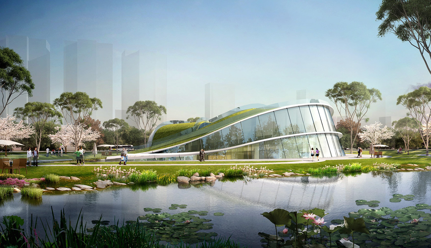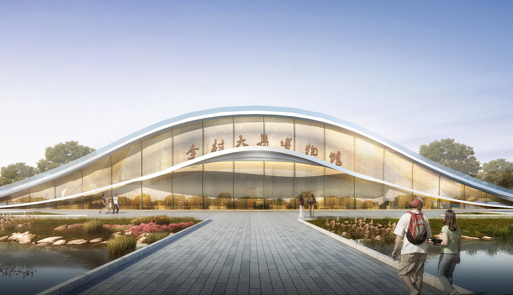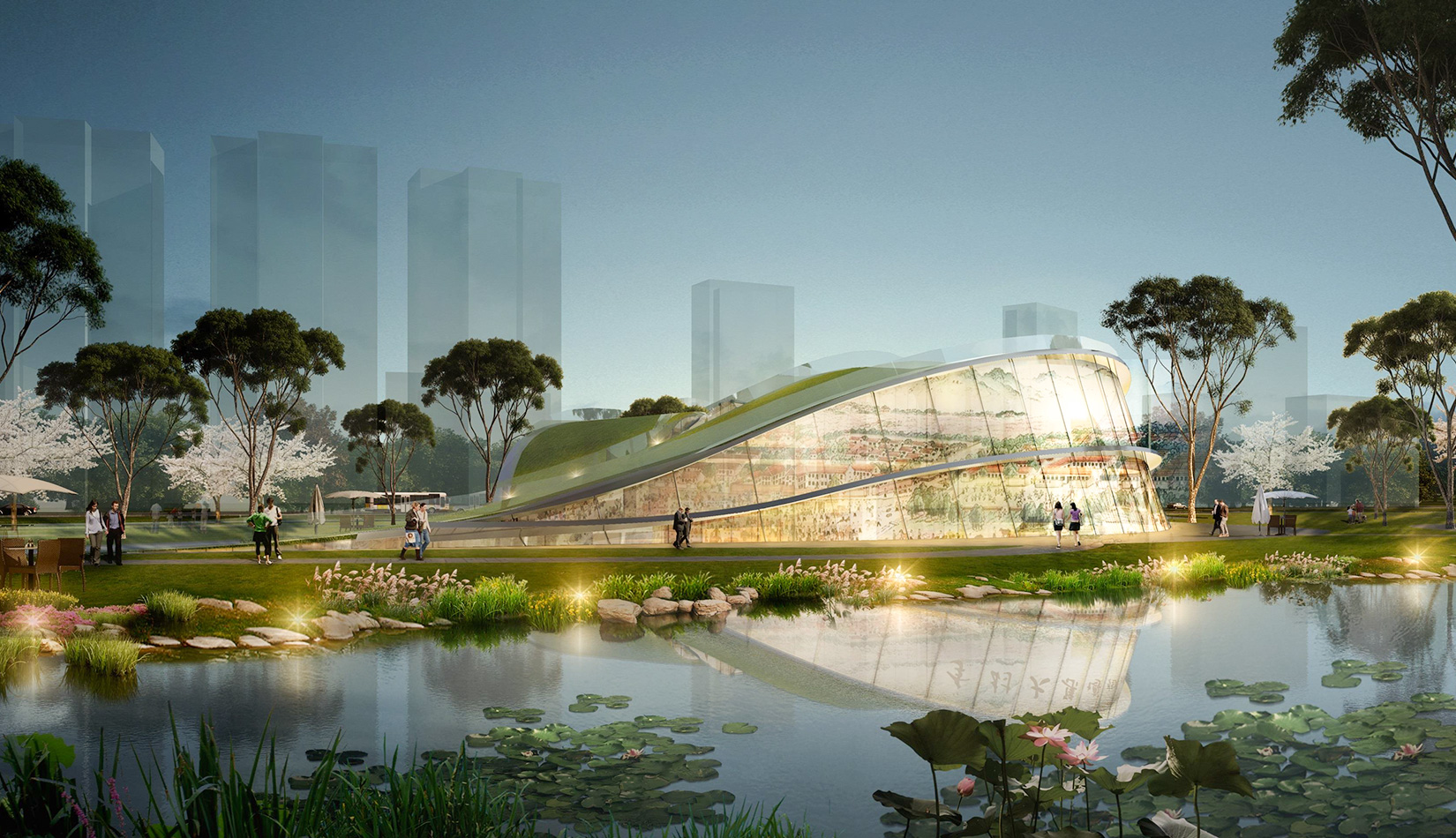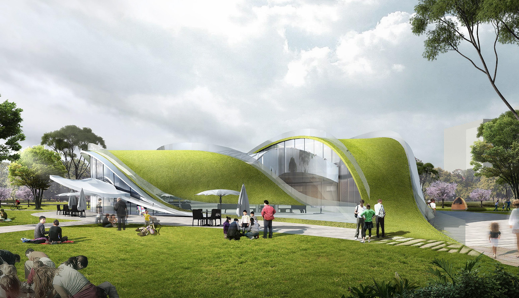該項目基地位于濱河公園內(nèi),目標要將博物館打造成一個生態(tài)建筑,建筑能與環(huán)境有機融合。在這一理念下,將博物館設計為樹葉形,建筑猶如一片樹葉飄落在公園內(nèi),以此體現(xiàn)建筑與環(huán)境的融合。將樹葉形建筑設計為覆土建筑,最大程度還原基地一片綠色,以此呼應李村大集的“還原”內(nèi)涵。通過設計兩個曲線形體相互交融形成建筑的最終體量,以此體現(xiàn)相逢意蘊,呼應李村大集的“相逢”內(nèi)涵。